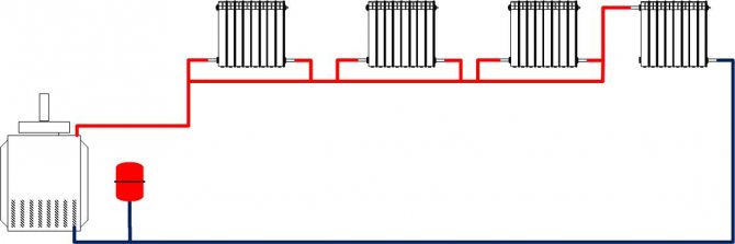 Радиаторните батерии се монтират последователно, без "основен" щранг - вижте схемата за отопление по-долу - това е случаят.