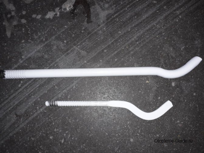 Монтажите за чугунени отоплителни радиатори са най-дебелите и тежки, тъй като трябва да държи голяма тежест в продължение на години. Тези извити щифтове или плоски куки се произвеждат отделно или са прикрепени към стоманена пръчка на 2-3 парчета.