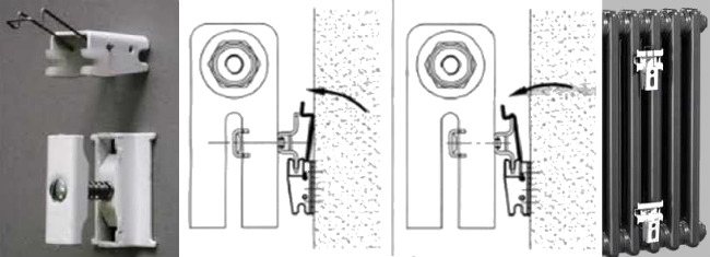 В допълнение към специалните скоби, чугунните батерии могат да бъдат окачени на конвенционални куки. Тези артикули се продават заедно с дюбели. От едната страна на тази кука има конец.