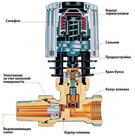 През годините от изобретението терморегулаторите за радиатори се променят и стават това, което ги познаваме. Конструктивно те се състоят от два основни елемента: клапан и термична глава, които са свързани помежду си чрез заключващ механизъм. Целта на термичната глава е да възприема температурата на околната среда и, за да я регулира, действа върху задвижващия механизъм - клапана, който блокира потока на охлаждащата течност, влизаща в нагревателя.