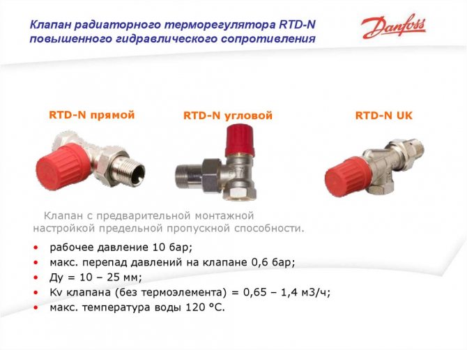 Клапаните за радиаторни термостати са разделени на: - клапани за двутръбна отоплителна система с помпа (тип RA-N) с повишено съпротивление с устройство за регулиране на капацитета на потока им за извършване на хидравлично балансиране на тръбопроводната система; - клапани с повишена производителност тип RA-G за изпомпване на еднотръбна или двутръбна гравитационна отоплителна система.