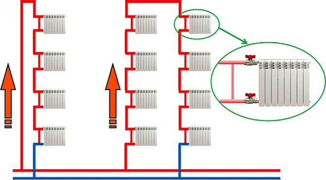 Еднотръбната система изисква по-малко материали за поставяне и се използва широко в многоквартирни жилища; по време на монтажа, за да се избегне основният недостатък - слабото отопление на най-отдалечения радиатор в мрежата, вмъкването на байпасен джъмпер помага. Целта на байпаса е да създаде допълнителна пътека, заобикаляща всички радиатори, осигурявайки подаване на охлаждаща течност със същата температура на всеки от тях, което допринася за по-равномерно отопление.