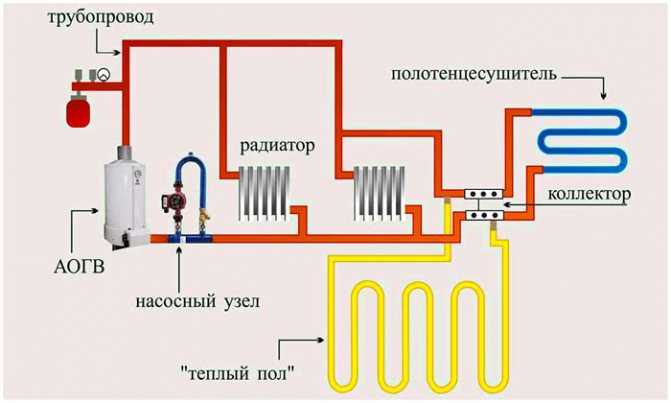 При наличието на голям брой топло водни подове в частна къща, тяхното свързване се извършва съгласно колекторна верига - това осигурява еднакво налягане и температура на водата във всяка верига.