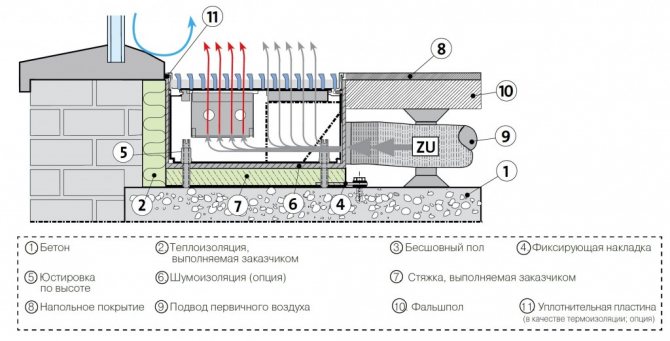 Направи си сам монтаж на подови конвектори се усложнява от факта, че трябва правилно да изберете размера на нишата - така че металната кутия на устройството да е разположена на правилната дълбочина. Можете да намерите препоръки по този въпрос в техническите листове с данни. Най-лошото от всичко е, че ако трябва да извършите монтаж във вече завършена къща, не е факт, че ще бъде възможно да се издълбае ниша в основата, тъй като това може да повлияе на нейната здравина. В този случай ще е необходимо да се увеличи височината на подовия етаж във всички стаи.