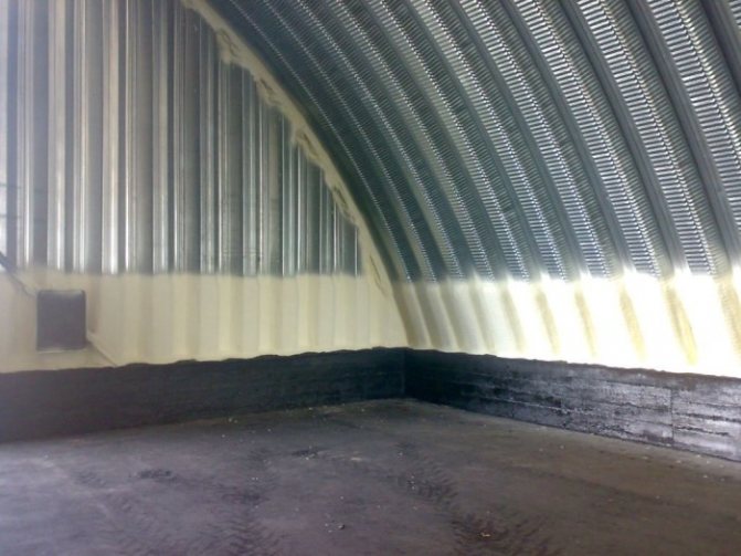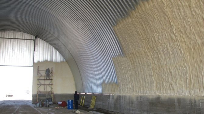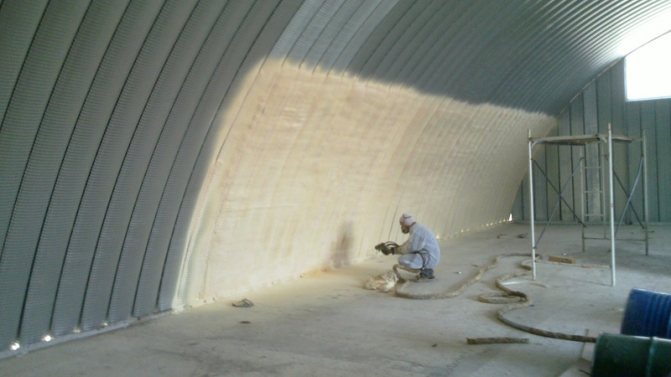 Както можете да видите от таблицата, повечето материали или не са подходящи за такава изолация, или са много скъпи. Най-добрият вариант е полиуретановата пяна - евтин пръскан материал, който отговаря на всички изисквания за изолация за хангар.