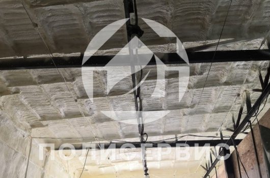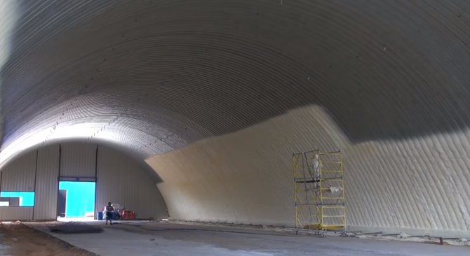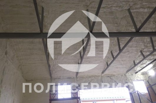 Не са необходими стенни стойки. Нанася се чрез пръскане под налягане 14 атм. На свой ред, пяната запълва всички празнини, пукнатини и дефекти на повърхността. Дебелината на слоя трябва да бъде приблизително 2-3 см, а в някои случаи - 5-10 см. Всичко зависи от местоположението на хангара, метеорологичните условия.