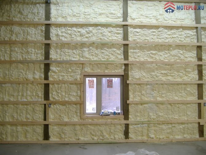 Топлоизолацията на сградата с полиуретанова пяна не изисква инсталиране на допълнителни конструкции. PPU се разпръсква равномерно, като боя, по цялата площ на стените. За висококачествена изолация от студа ще трябва да нанесете състава няколко пъти. Стените могат да бъдат завършени с покритие (мазилка, боя, гипсокартон) или да останат непокрити: повърхностите, изолирани с полиуретанова пяна, не се разрушават от механично напрежение.