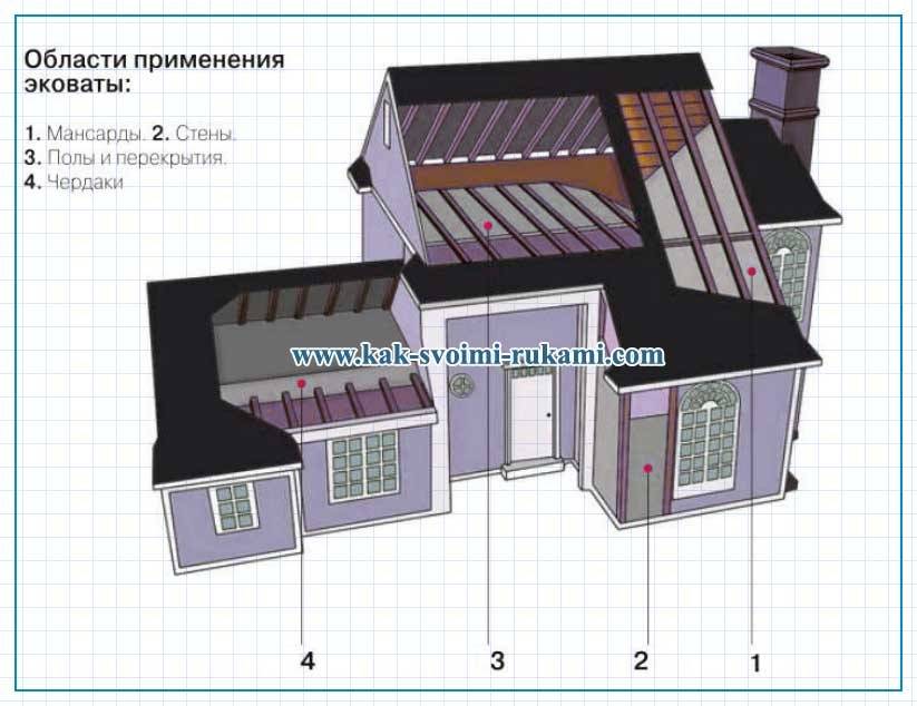По отношение на топлоизолацията, ековата е идеална за монтиране на отопляеми тавани и тавани, тъй като се счита за екологична и не позволява изтичане на топлина. За тези цели дебелината на материала трябва да бъде най-малко 75 mm, оптимално 100 mm.