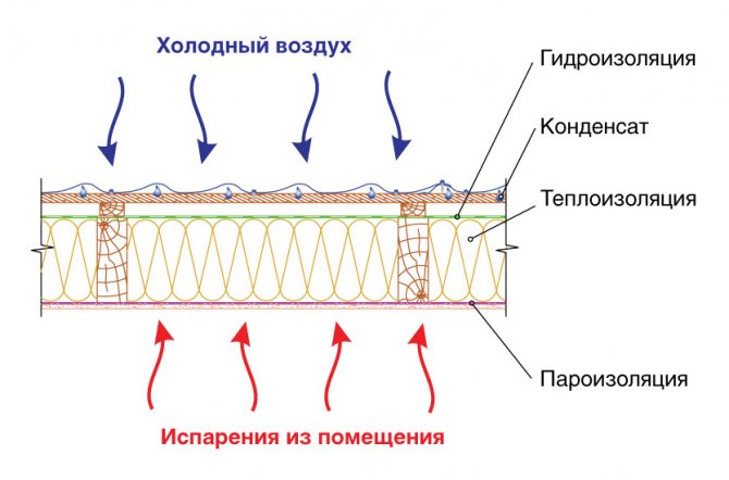 В добре подредения пай всичко, което успя да пробие пароизолацията, се втурна през изолацията към хидроизолацията, която свободно преминава пара извън конструкцията, но изключва проникването на дъждовни капки и стопена вода в топлоизолацията.