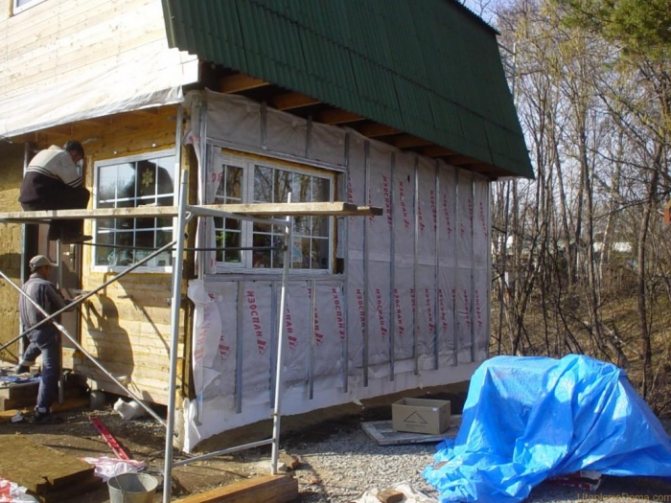 - Този материал най-често се използва за изолация на дървени къщи. Това се дължи на факта, че дървените стени трябва да "дишат". Пенопластът за изолация в този случай не е подходящ. В този случай полезните свойства на дървото ще бъдат обезсилени. Ако фасадата е изолирана, тя трябва да бъде от шарнирен вентилиран тип. В такива стени се изисква мембрана за бариера срещу пара.