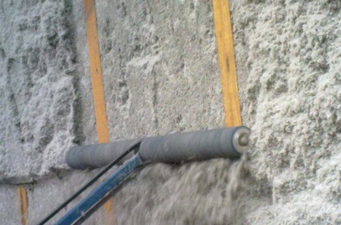 - Мокър начин. Лигнинът служи като адхезивен пълнител в това изпълнение. Мокрите влакна се прилепват добре към всеки субстрат. Изолационният слой трябва да е вътре 50-60 кг / куб Този метод е добър за изолиране на блокови или тухлени стени. Решетката е направена от пръчка или профил (първият вариант е за предпочитане). Изолацията се прилага с помощта на професионална инсталация. Разхлабената памучна вата на самия изход на дюзата се импрегнира с вода и се доставя на повърхността под налягане. Мокрият метод е лесен и бърз, незаменим за големи обеми. Единственият недостатък е наличието на професионално оборудване. За трудни повърхности като тавана, от долната страна, лепилата се разтварят във вода за здравина, за да помогнат на линията да увеличи адхезията. Излишъкът се отрязва на ниво и се използва повторно след изсушаване. Всъщност няма отпадъци за всяка опция за инсталиране, тъй като памучната вата е подходяща за повторна употреба.