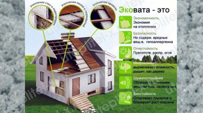 Ecowool е най-изгодната опция за изолация на помещения. Тъй като ecowool (цената на който е много по-ниска от тази на други нагреватели) съдържа антисептици в състава си, това гарантира по-дълъг експлоатационен живот, защита от увреждане от гъбични образувания и плесени, а също така изплашва гризачите. Ecowool има добра адхезия: