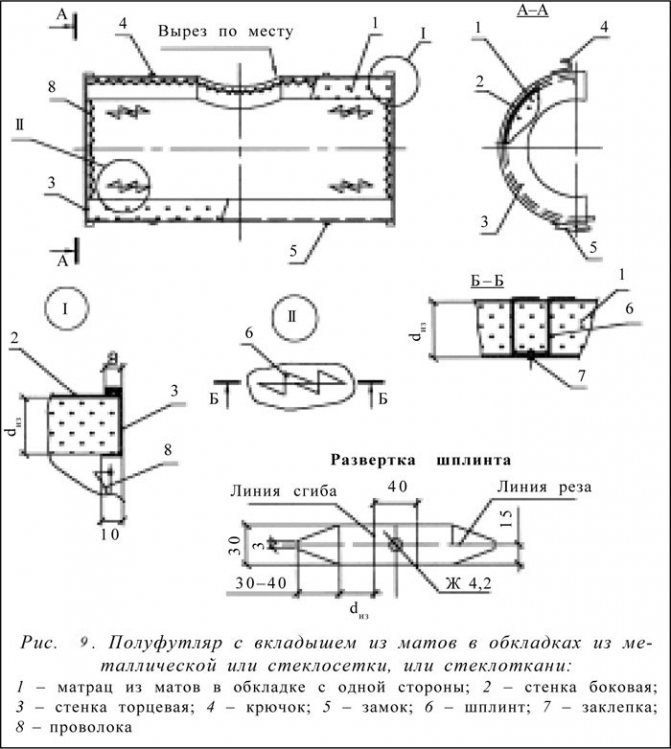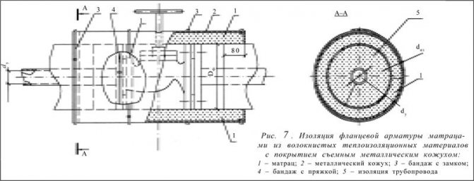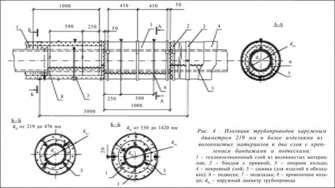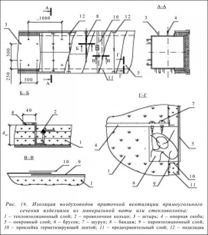 Препоръчително е да се използват топлоизолационни плочи за топлоизолация на правоъгълни газопроводи. Закрепването на топлоизолационния слой може да се извърши с помощта на щифтове (заварени, вградени) и превръзки (или телени пръстени) (фиг. 18 и 19).