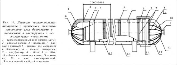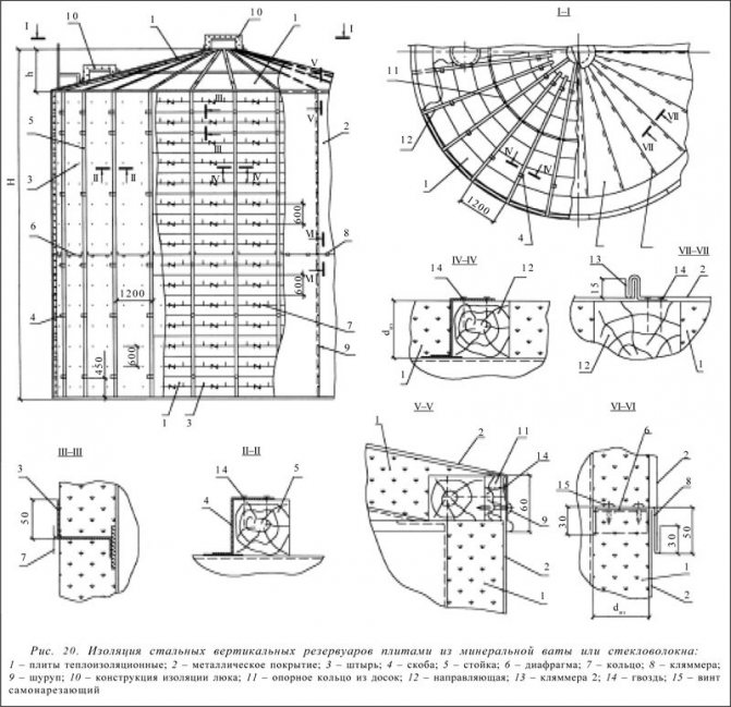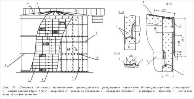 За топлоизолация на резервоари за съхранение на нефт и нефтопродукти се препоръчва използването на топлоизолационни плочи от минерална и стъклена вата. Плочите са прикрепени към стената на резервоара с щифтове, заварени с стъпка от 600x600 или 400x400 mm. За закрепване на металния капак могат да бъдат предвидени носещи конструкции от вертикално разположени стоманени ъгли или ленти. Защитният капак се закрепва с винтове. Елементите на защитното покритие могат да се комбинират в картини. Може да се осигури и дървена рамка. В този случай покриващият слой се закрепва с винтове към рамката, направена от дървени блокове вертикално и с винтове хоризонтално (фиг. 20). Монтажната стъпка на носещите конструкции се определя от размерите на защитните покривни елементи и топлоизолационните плочи. Допълнително закрепване на плочите може да се осигури чрез превръзка по протежение на щифтовете с тел (под формата на пръстени или напречно). По височината на резервоара трябва да бъдат осигурени опорни рафтове, за да се предотврати плъзгането на топлоизолационния слой. На мястото на монтиране на опорните рафтове също са предвидени компенсатори в покривния слой. Подложките в телените мрежести облицовки могат да се използват и за изолиране на резервоари. Разстоянието между заваряването на щифтовете е 500x500 mm. Ако към повърхността на резервоара са заварени превръзки с стъпка от 3 м, тогава може да се използва конструкция от шарнирни матраци, направени от рогозки с топлоизолационен слой рогозки, зашити в облицовки от двете страни на стъклен плат или стъклена мрежа ( Фиг. 21).