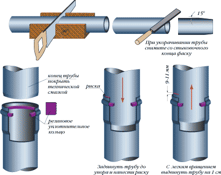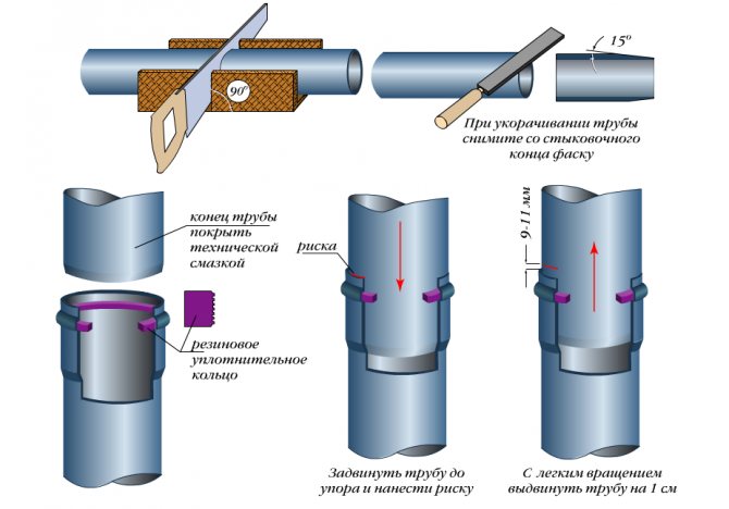 След като се уверите преди монтажа, че в гнездото има гумен пръстен, трябва да го почистите от различни замърсители, след което ще можете да постигнете добра адхезия. За да се подобри уплътнението, върху гладкия ръб на тръбата трябва да се нанесе смазка. След това се извършва докинг.
