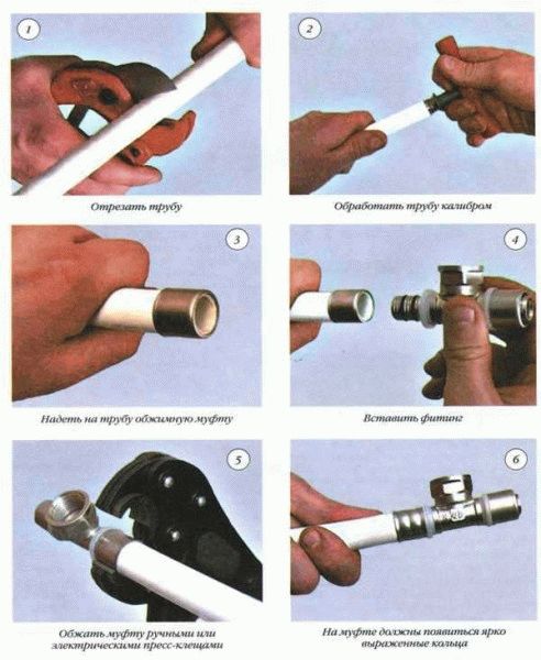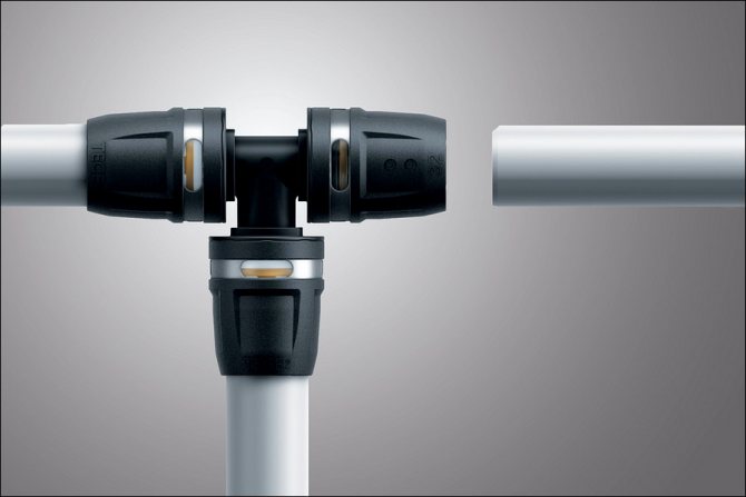 След това се хвърля специален съединител и самият фитинг с О-пръстени се вкарва в тръбата. Отгоре се извършва кримпване с подготвени клещи. По този начин е възможно да се стикира пластмасовите елементи.