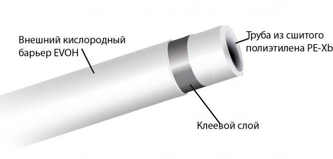 - Изработена от металопластика. Това са продукти с многослойна структура на стената, където външният и вътрешният слой са направени от обикновен или омрежен полиетилен, бариерният слой е направен от алуминиево или медно фолио с дебелина 0,2–0,5 mm. За залепване на слоевете се използва адхезивна маса. Наличието на метален слой увеличава якостта на металопластичните тръби, намалява тяхната термична деформация. Областта на приложение на такива продукти са системи за захранване със студена / топла вода и отопление, работещи с работно налягане не по-високо от 10 атмосфери и температурен режим до +95 ºС.