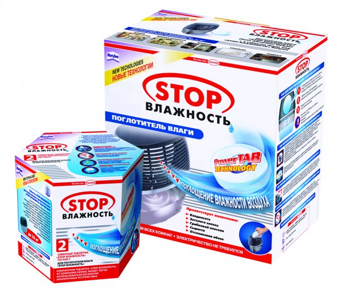 Използват се специални абсорбиращи таблетки (Ceresit "Stop Moisture", Henkel "Stop Moisture") заедно с десикант - контейнер, в който соленият разтвор, образуван от абсорбираната влага, тече надолу. Такова устройство е способно да абсорбира около 0,4 литра вода на месец. В този случай площта на помещението не трябва да надвишава 20 кв. м. Една таблетка е достатъчна за два до три месеца употреба.