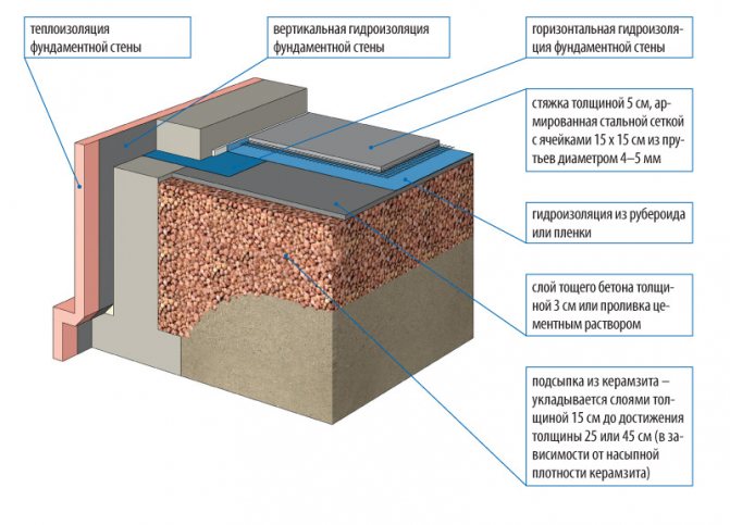 Експандираната глина е производно на обикновената глина. Притежавайки микропореста структура, той перфектно задържа топлината. В същото време усвоява усърдно влагата и е много трудно да изсъхне. За да се избегне процесът на намокряне на изолацията, изолационната възглавница е снабдена с хидроизолационен слой, както от долната част, прилежаща към земята, така и по горната част на зоната на изолационното покритие.