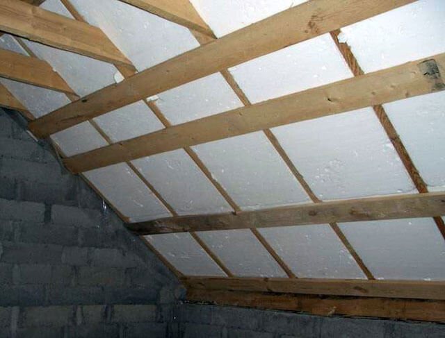 За изолация на покрива между гредите не се използват плочи от пяна, тъй като е трудно да се изреже материалът ясно в зависимост от размера на клетката. Неизбежните пропуски ще се превърнат в студени мостове. Освен това, ако гредите не са сглобени според размера на материала, ще има много отпадъци при рязане.