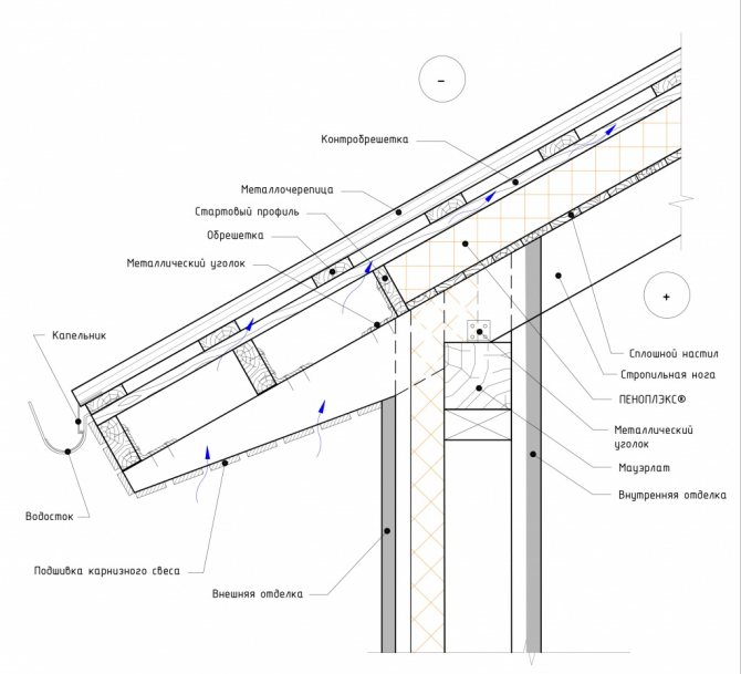 Зад изолационния контур са монтирани допълнителни тяги, които осигуряват посочения наклон на покрива. Върху покривното покритие е монтиран фронтон, който е механично фиксиран към гредите и решетката.