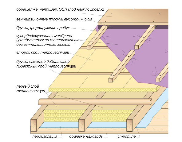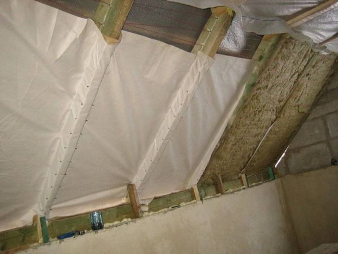 Вместо конвенционалните хидроизолационни филми може да се използва супер дифузионна мембрана. Този материал ви позволява да правите без вентилационна междина, което ще опрости процеса на инсталиране на изолация. Такъв филм ще спести място и ще ви позволи да поставите изолацията до цялата височина на гредите, напълно запълвайки клетките.