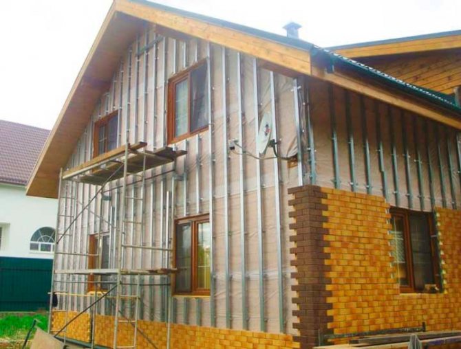 - Към фасадата е прикрепен хидроизолационен филм. Следващите стъпки зависят от производителя на панелите, прочетете внимателно инструкциите, ако не планирате да изолирате пространството, можете веднага да инсталирате метална или метална щайга. Всеки производител препоръчва ламели с различни размери, така че проверете с инструкциите.