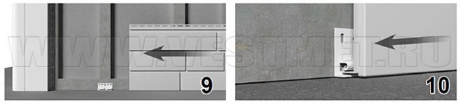- Монтажът на предните панели се извършва отляво надясно, в зависимост от местоположението на елементите с жлеб и жлеб. Стените са завършени на свой ред, за да се избегне проникването на влага до края на работата. Всеки следващ ред се монтира с изместване наполовина или една трета от размера на елементите. Това допринася за по-добро прилягане и естествен вид.