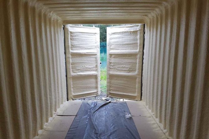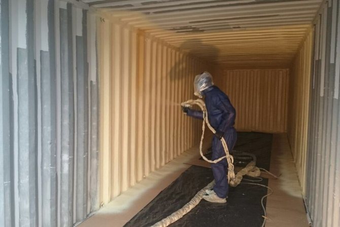 По очевидни причини такъв транспортен контейнер е изолиран само отвътре. Полиуретановата пяна прилепва добре към почти всяка повърхност, без да се налага използването на допълнителни агенти - грундове, хидро и пароизолационни филми.