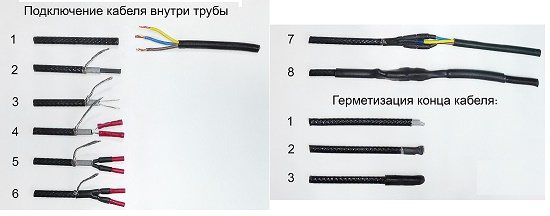 Краищата на нагревателните елементи и захранващите кабели вече са свързани в термосвиваема тръба, снабдена с метална втулка. Той се нагрява и затяга, мястото на контакт се обвива с термо лента и след това се затваря с друга защитна тръба.