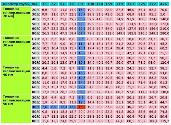 Използвайки таблицата, изборът на правилния вариант е малко по-лесен. За да направите това, първо трябва да разберете диаметъра на тръбата и дебелината на изолацията, както и прогнозната разлика между температурата на въздуха и съдържанието на тръбопровода. Последният индикатор може да бъде намерен с помощта на референтни данни в зависимост от региона.