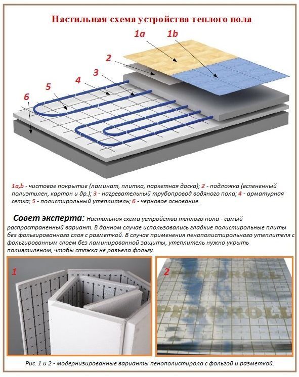 Полагането на топъл воден под върху постелки, както е показано чрез сравнение на топлоизолационните материали (техническите им характеристики и трудностите, свързани с монтажа), е по-целесъобразно. Допустимо натоварване на системата от пенополистирол 50 kN / m². Теглото на конструкцията позволява монтаж дори в високи сгради на най-горните етажи, където използването на бетонова торта е забранено.