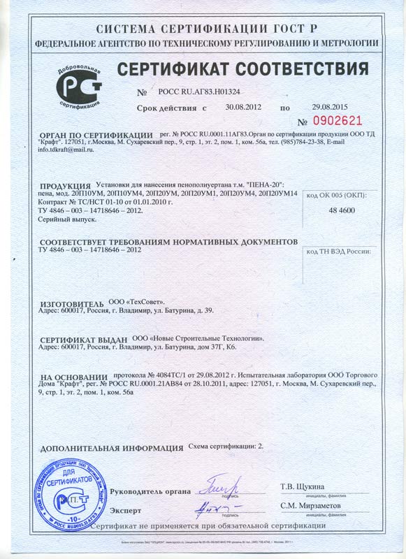 | Сертификат за оборудване от серия FOAM за полиуретанова пяна |