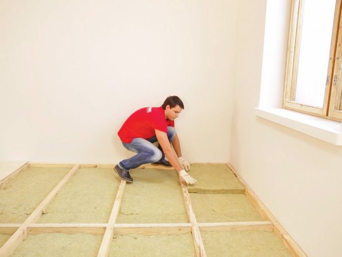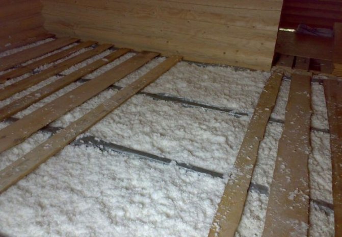 Ако под земята е високо, тогава е по-добре да поставите изолацията между трупите. Подходящ е 15 см слой стъклена вата, без фенолни свързващи вещества или еко вълна - целулозна вълна. Първо, гредите се завинтват към трупите отдолу (отстрани), подовата настилка е направена от тънки дъски, шперплат, шисти ..., върху които е поставена бариерата срещу пара.