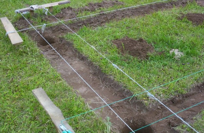 - Според маркировката изкопах траншеи с ширина около 40 см (20 см - ширината на основата и 10 см от всяка страна - за монтиране на кофража) и дълбочина 70 см.