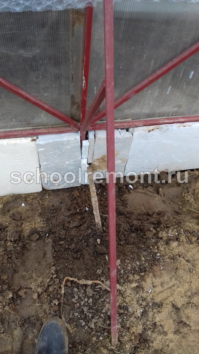 Забележка! За да се увеличи здравината вътре в кофража, може да се монтира метална армировка от заварени или залепени пръти. Направих малка оранжерия, така че се ограничих до полагане на единични подсилващи пръти, малко количество скрап и счупен камък.