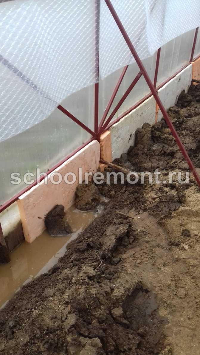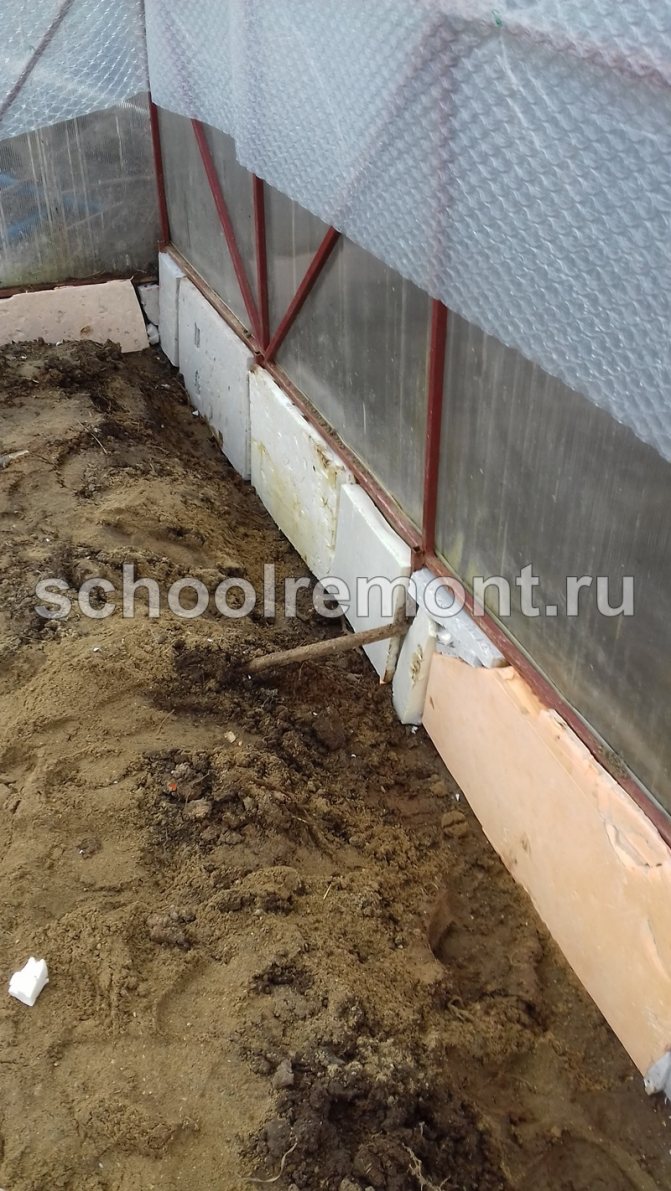 Ако конструкцията е инсталирана директно на земята, първо, почвата е изолирана в оранжерията. За тази цел от топлоизолационен материал е изграден защитен цокъл с височина 50-60 см. В работата могат да се използват плочи от газобетон, дървен бетон, пенобетон или експандиран глинен бетон. Самата основа е заровена частично в земята, за да се увеличи стабилността. Като алтернатива на новата основа, изолацията може да се извърши чрез повдигане на самите легла над нивото на земята на ниво 50 - 70 cm.