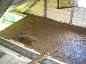 След приготвянето на покритието се полага пароизолационен филм, върху който се нанася разтвор от глина и дървени стърготини (дебелина на слоя 10-15 см). Отначало е необходимо да се контролира как разтворът изсъхва.Всички пукнатини трябва да бъдат запълнени с глина.