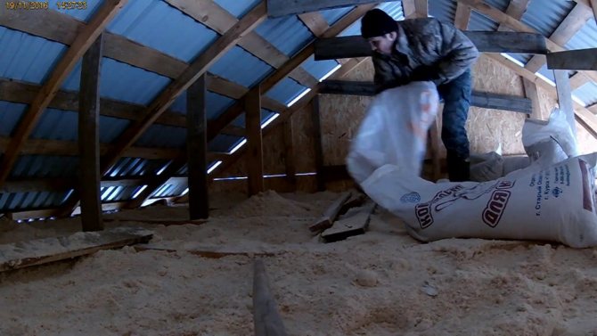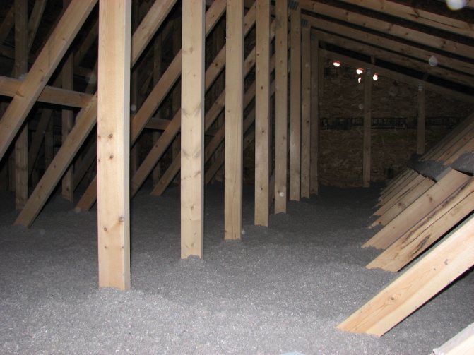 Естеството и първите етапи на тези работи са същите, както в случая на дървени стърготини. След подготовката на повърхността се полага памучна вата, пукнатини и дупки се издухват (големите трябва да се уплътняват) и след това всичко това се покрива с филм. Можете да поставите дъски отгоре или да направите замазка.
