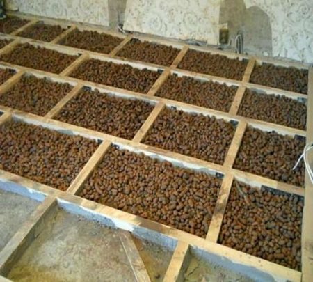 Що се отнася до експандираната глина, тя просто се разпръсква по повърхността на подовата настилка, след като е запълнила ограничителните елементи по периметъра на последната. Това могат да бъдат едни и същи ламели, подредени вертикално в три реда. Дебелината на разширения глинен слой от 150 мм е повече от достатъчна.