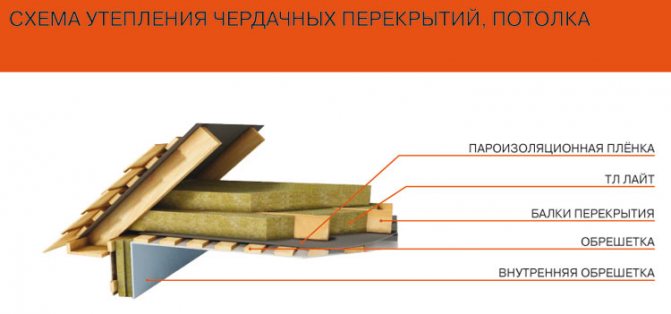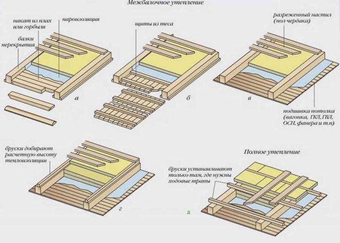 Ето класическа схема за изолиране на таван в дървена къща със собствените си ръце от таванската страна.