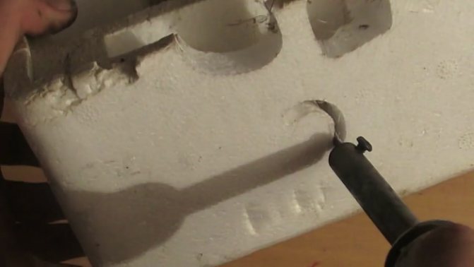 - Следващата стъпка е да загреете ножа с газова печка или специална газова горелка.С нажежен до червено нож трябва внимателно да изтеглите по маркираната линия, пяната ще започне да се топи и да се реже ясно по линията.
