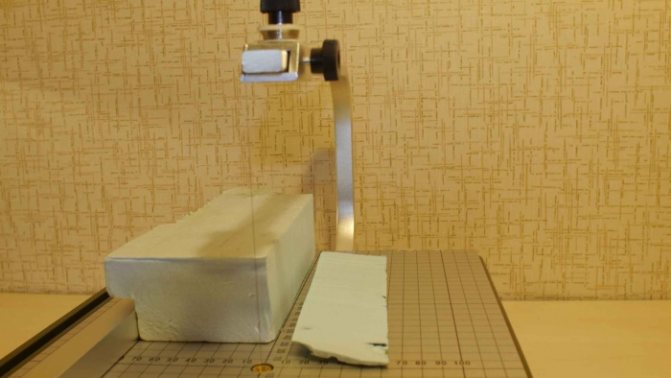 Нагрятата нихромова нишка лесно отрязва хоризонтално блок от пяна, който се движи на ръка. В резултат се получават плоски листове изолационен материал. Тяхната дебелина се определя от разстоянието, разделящо опънатата жица от работната повърхност на масата.