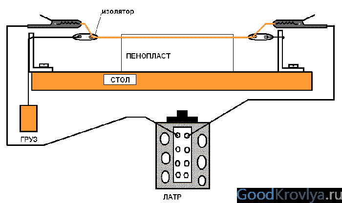- Между изолаторите е изтеглен нихромен проводник. От него е окачен специален товар. Необходимо е за затягане на конеца.