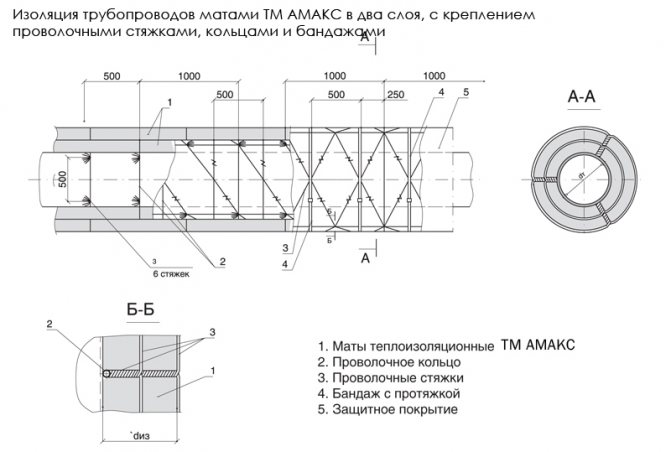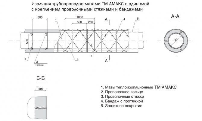 - за тръбопроводи с външен диаметър на топлоизолационния слой не повече от 200 mm - закрепване с тел с диаметър 1,2-2 mm в спирала около топлоизолационния слой, докато спиралата е фиксирана върху телени пръстени по краищата на постелките. Ако в плочите се използват рогозки, тогава краищата на плочите се зашиват със стъклена нишка, силициев конец, ровинг или тел с диаметър 0,8 mm;
