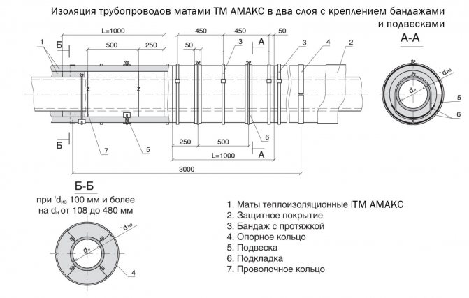 На вертикални тръбопроводи с външен диаметър 530 mm и повече, топлоизолационният слой се закрепва върху телена рамка с инсталирането на телени струни, които предотвратяват плъзгането на закрепващите елементи (пръстени, ленти). Пръстени, изработени от тел с диаметър 2-3 mm, са монтирани по дължината на тръбопровода върху повърхността му с стъпка 500 mm за плочи с дължина 1000 mm и ширина 500 mm и рогозки с ширина 500 и 1000 mm. Снопове телени връзки с диаметър 1,2 mm са прикрепени към пръстените със стъпка по дъгата на пръстена от 500 mm.