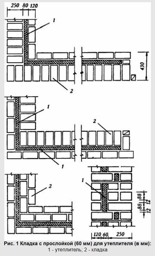 С тази опция разходът на тухли е намален с 15-20% в сравнение с масивна тухлена зидария на стена с дебелина 51 см и стени с дебелина 35-40% - 64 см. Съпротивлението на топлопредаване на стената при използване на минерална вата като нагревател се увеличава с 60% при използване на експандиран полистирол - със 100%, разходът на разтвор се намалява с 35%, а разходите за труд намаляват с 10%.