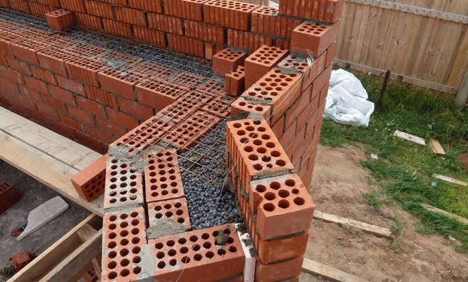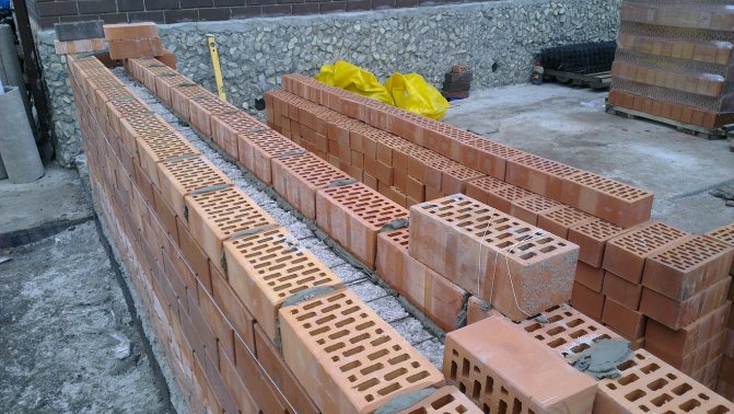 - На хидроизолационния слой на основата се полагат 2-4 слоя плътна тухлена зидария, в ъглите, започващи от челните страни. Всеки ред е подсилен с подсилена мрежа.