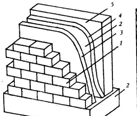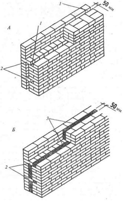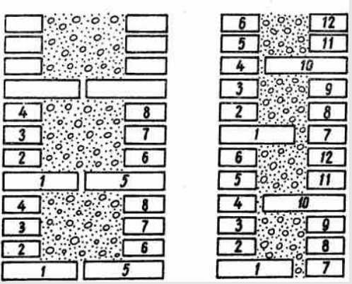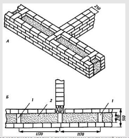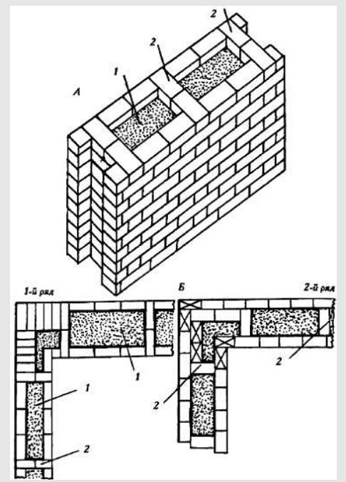 Това са две успоредни стени, между които се полага слой от лек бетон. Тухли, положени с мушка и изпъкнали в зидарията, осигуряват закрепване на надлъжни стени с бетон (на фигурата вляво 1 - тухла; 2 - бетон).