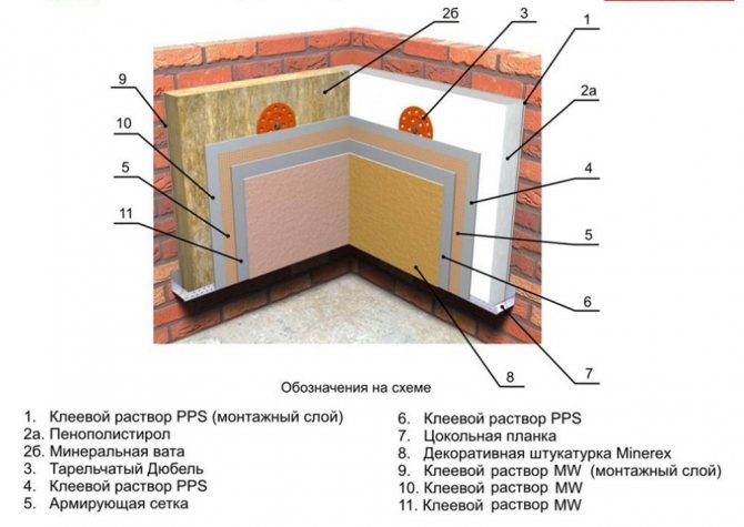 Външната изолация предвижда задължителна облицовка на стени. За външна изолация е по-добре да използвате плочи от минерална вата или полистиролов ориз. наляво: